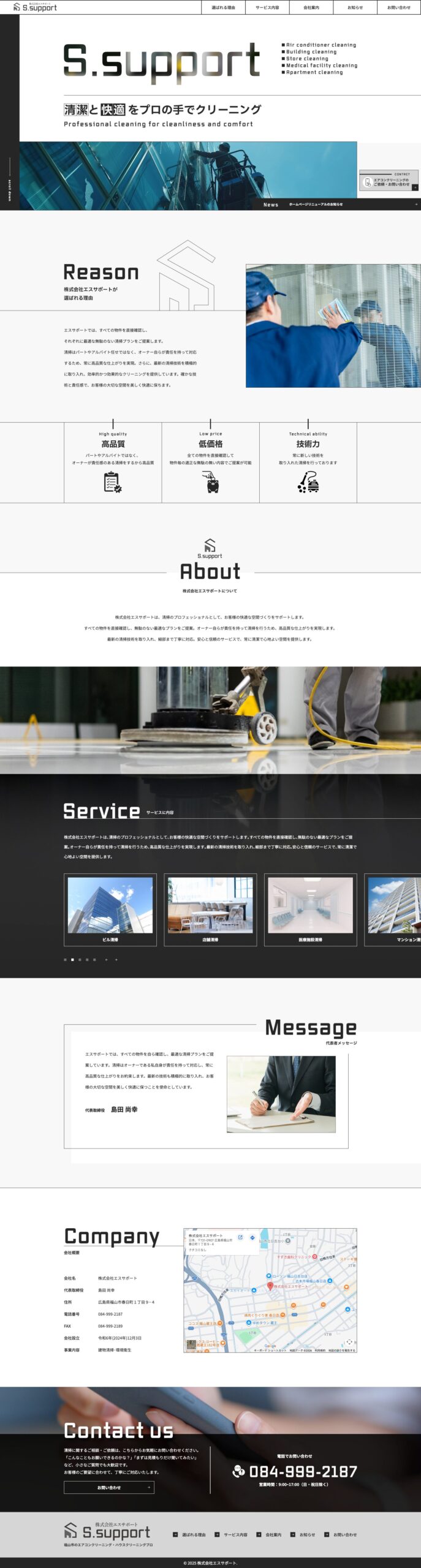株式会社エスサポート様のホームページ制作において、私たちは「清掃のプロフェッショナルとしての信頼感と安心感を伝えること」を第一に考えました。パートやアルバイト任せではなく、オーナー自らが責任を持って対応するという同社の強みと、お客様の空間を大切に思う真摯な姿勢がサイト全体から伝わることを目指しています。 個人のお客様向けのエアコン・ハウスクリーニングから、法人向けのマンション・ビル・医療施設清掃まで、幅広いサービス内容をユーザーが直感的に理解できる分かりやすさを重視しました。 福山市で新たにスタートを切ったエスサポート様の企業の顔として、ブランド価値を高め、お問い合わせへとスムーズに繋がるサイトに仕上げています。