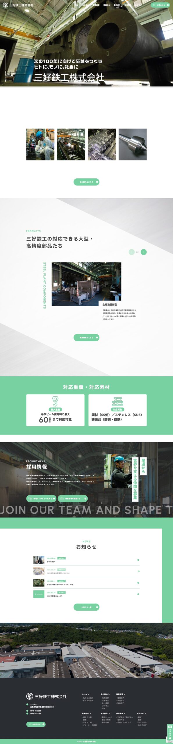 鉄工所としての力強さと信頼感を感じさせる「重厚感のあるトーンと金属を思わせる質感」を基調に、視認性が高く洗練されたデザインを追求しました。世界の産業インフラを根底から支えるスケール感と、100年続く企業の歴史が両立するよう、余白の取り方やダイナミックなタイポグラフィを工夫しています。働く職人の真剣な眼差しや、圧倒的なサイズの加工部品の写真を効果的に配置し、三好鉄工様ならではの「技術力・対応力・人間力」が直感的に伝わるビジュアルに仕上げました。